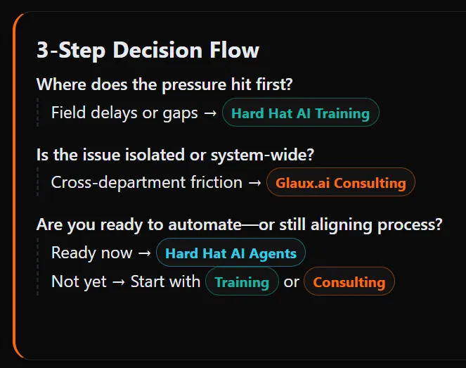 Glaux AI Consulting brings structure where chaos costs you margin. We don't add more meetings or headcount — we streamline workflows, eliminate duplicate work and align decision making across teams. By embedding AI into your core processes, handoffs become seamless, accountability sharpens and execution speeds up.